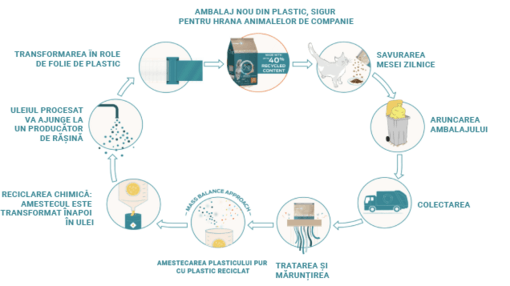 Angajamentul nostru față de animalele de companie înseamnă și angajamentul către un viitor fără deșeuri, prin reducerea dependenței noastre de plasticul nou în timpul producției ambalajelor noastre. Abordarea mass balance ne permite să avem plastic reciclat împreună cu plasticul virgin în timpul procesului de producție, pentru a crea ambalaje noi. Cu toate acestea, dată fiind complexitatea metodei de procesare, este dificil să se determine cantitatea exactă de plastic reciclat care intră în fiecare ambalaj individual. Prin urmare, fiecare ambalaj poate varia în ceea ce privește cantitatea totală de plastic reciclat pe care o conține. Dar datorită abordării mass balance, putem asigura că până la 40% din plasticul reciclat este alocat unei întregi serii de ambalaje.