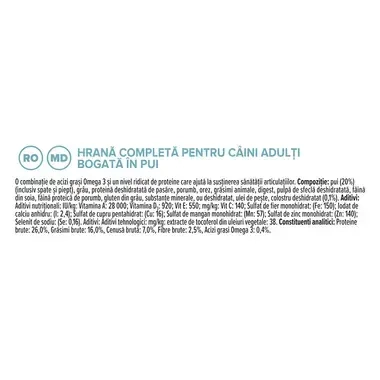 - O combinatie de nutrienti cheie (acizi grasi si proteine) care ajuta la sustinerea articulatiilor sanatoase pentru stilul de viata activ al cainelui tau.