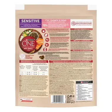 PURINA ONE® MINI Sensitive, cu Somon și Orez, hrană uscată pentru câini