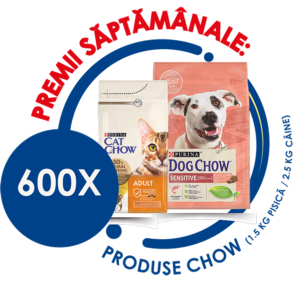 Campanie organizată de Nestlé România S.R.L., în perioada 06.08.2025 - 28.10.2025. Cumpără minimum 1.5 kg hrană uscată PURINA Cat Chow sau minimum 2.5 kg PURINA Dog Chow, la sac sau vrac. Sunt oferite 430 de premii prin tragere la sorți, în valoare totală de 126.219,80 lei (TVA inclus). Campania este valabilă în magazinele de tip pet shop, pet supermarket, farmacii, clinici veterinare și magazinele online, care semnalizează vizual promoția. Înscrierea se face în baza bonului fiscal, care trebuie să menționeze brandul (Cat Chow sau Dog Chow). Participanții care au câștigat premii săptămânale rămân eligibili și pentru extragerile lunare și pentru tragerea finală. Lista completă a produselor participante și regulamentul oficial sunt disponibile gratuit pe www.purina.ro/chow2025. Păstrează documentul fiscal în original pentru validare. Imaginile premiilor sunt cu titlu de prezentare.
