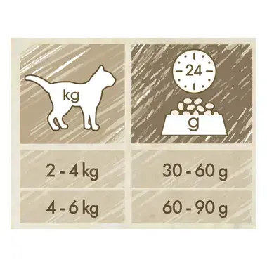 Pentru cantitatea medie recomandată pentru menținerea greutății la adult s-au luat în considerare pisici cu activitate moderată, aflate în condiții normale de temperaturi ambientale. Nevoile individuale variază și cantitățile de hrană trebuie adaptate corespunzător pentru a menține o greutate normală și sănătoasă a pisicii.